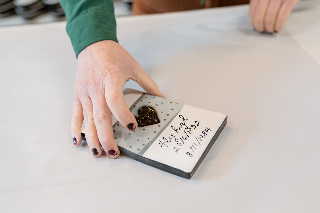 Yes, I can handwrite names, dates, or short messages on your tile using a special underglaze pencil. These appear above and below the heart-shaped center where your loved one's ashes are incorporated.
