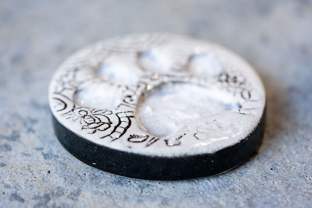 Using a small portion of your pet's ashes, I create a unique ceramic piece that celebrates their life and the joy they brought to your home. Each tile features a smooth glazed paw print center incorporating their ashes, surrounded by an delicate lace pattern pressed into the ceramic.