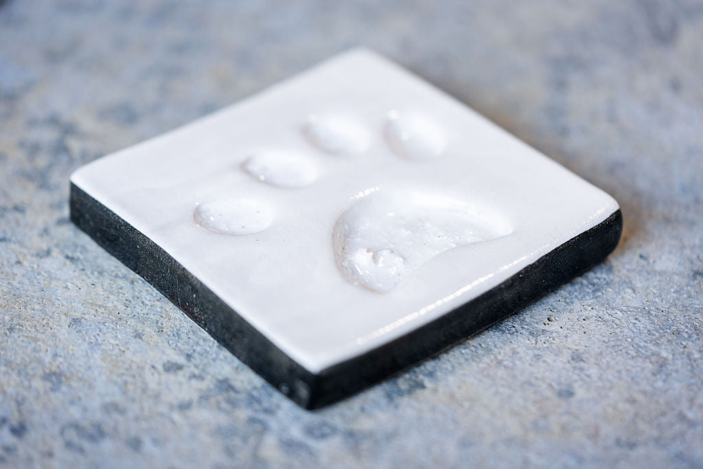 For personalized tiles, your pet's name or a short message is applied in handwritten ceramic underglaze pencil or script writing in underglaze. For those preferring a minimal aesthetic, the clean square design allows the unique paw print center to become the focal point.